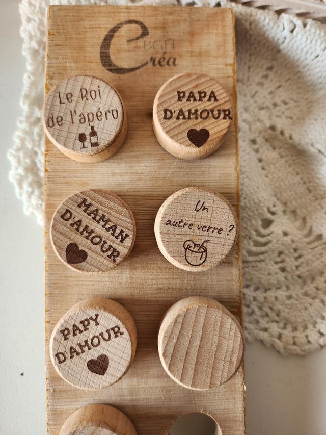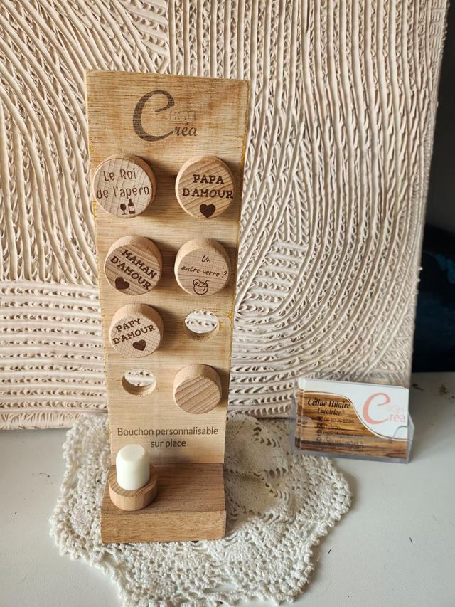 Possibilité de graver un mot ou dessin selon votre choix. Rechercher "bouchon à personnaliser " sur le site.