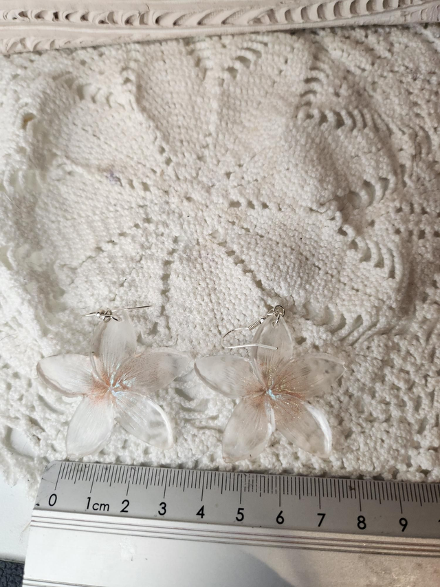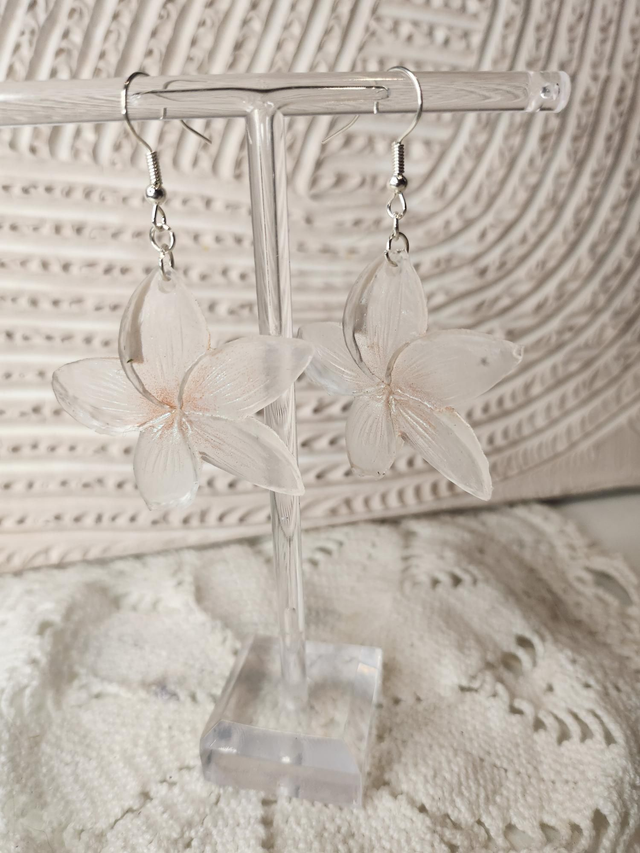 Boucles d'oreilles transparentes fleurs de tiares en résine.