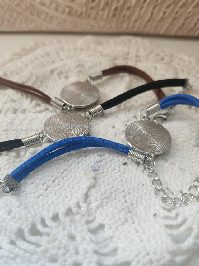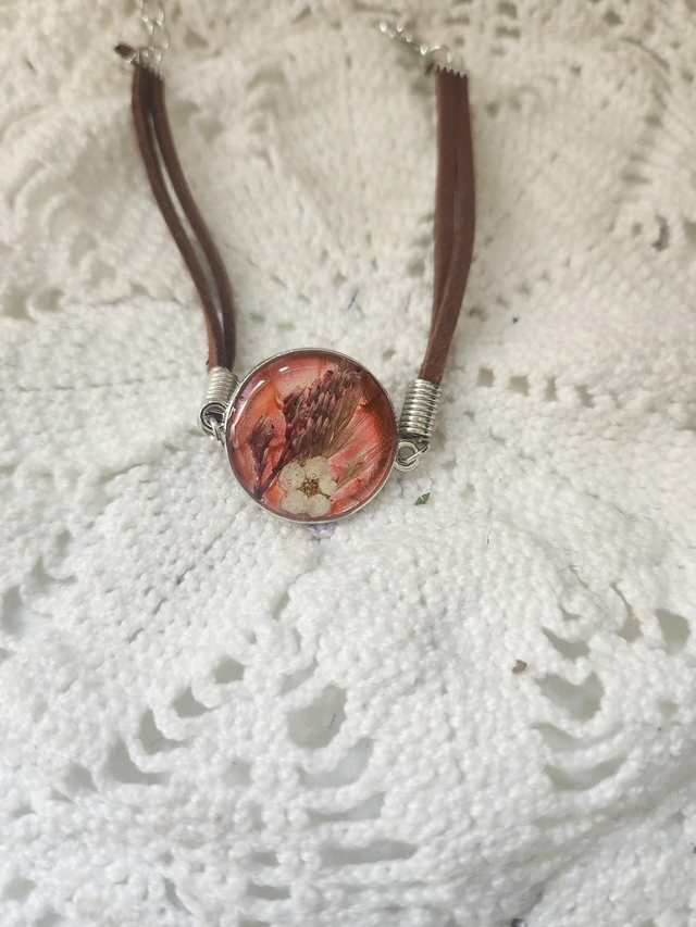 Bracelet cordon marron avec fleurs séchées . Couleur argent