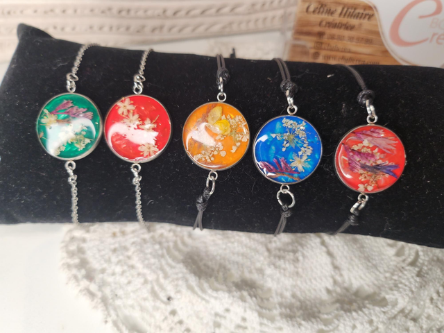 Bracelet avec fleurs séchées et résine.