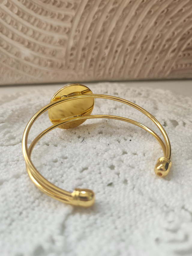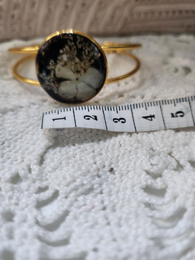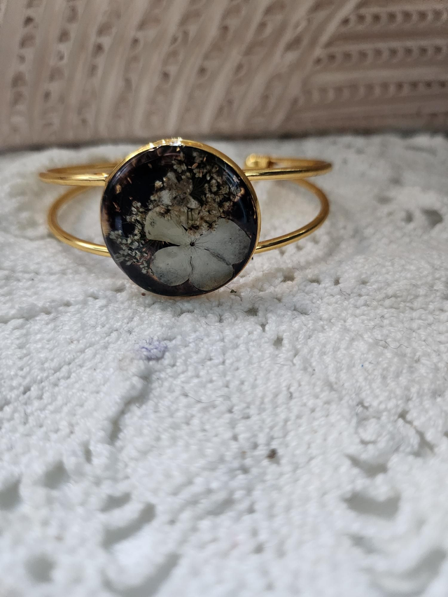 Bracelet rigide fond noir avec fleurs séchées . Couleur or