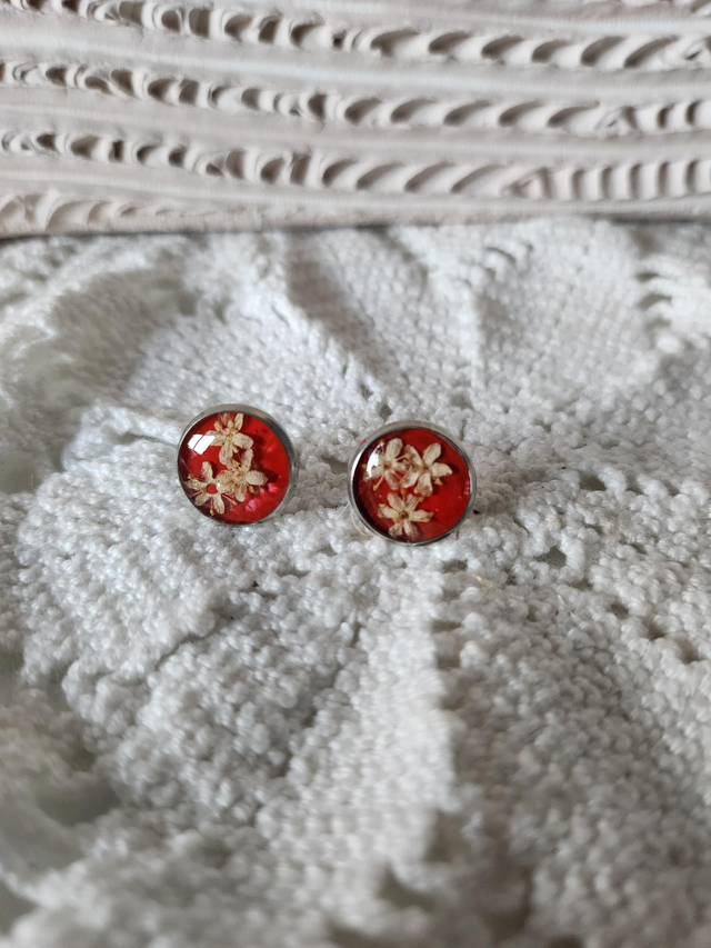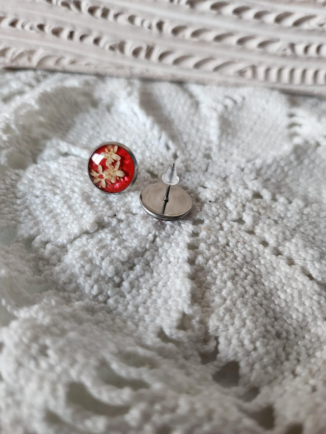 Boucles d'oreilles fleurs séchées résine fond rose.