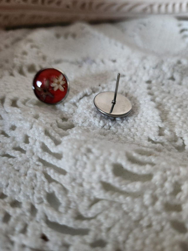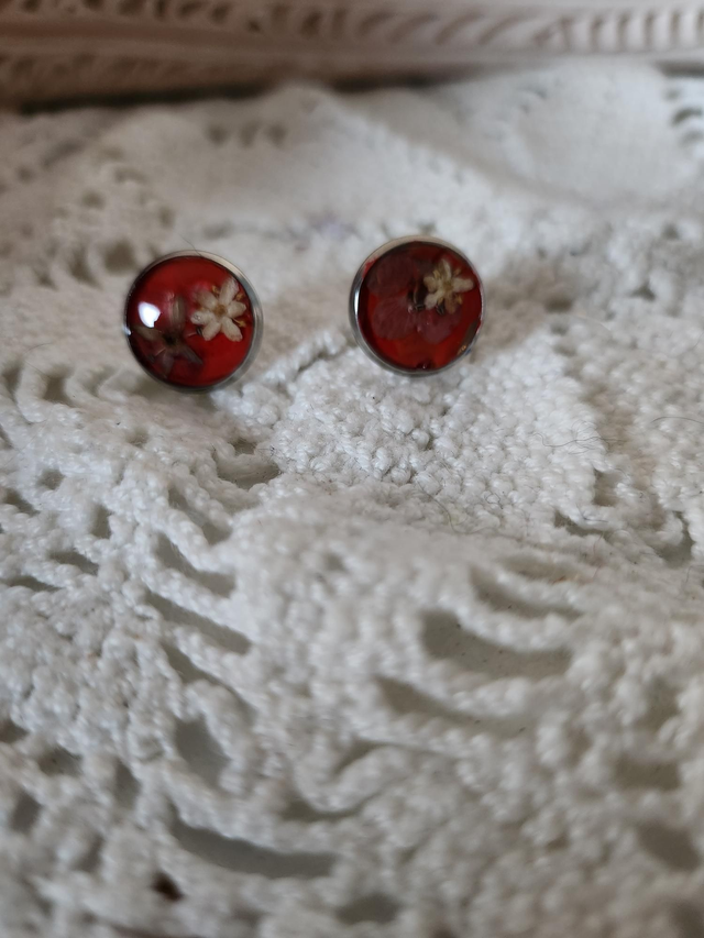 Boucles d'oreilles fleurs séchées blanche et bleu résine fond rose.