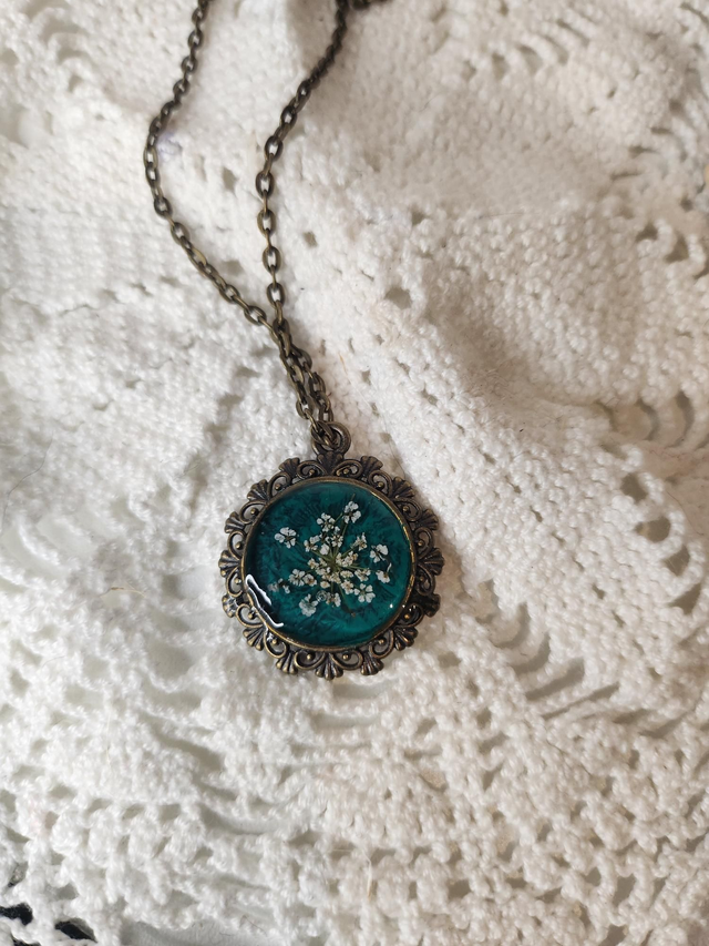 Collier cabochon fleurs séchées fond bleu turquoise