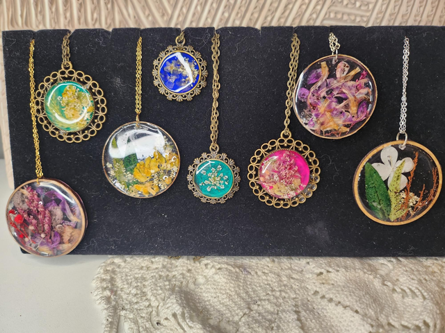 Je ramasse moi-même mes fleurs que je fais sécher. Elles viennent de mon.jardin, de mes promenades où du jardin de mes amis😅. Ensuite je mets plusieurs couches de résine pour les solidifier.