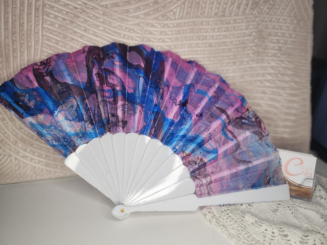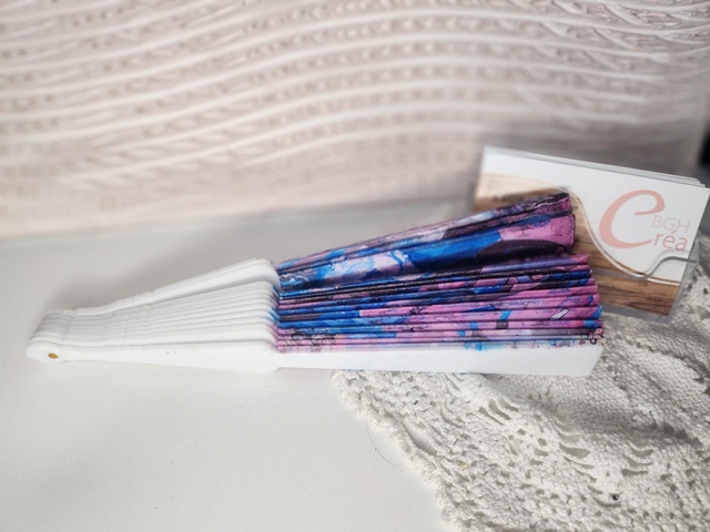 Eventail plastique et tissu peint avec la technique de l'hydrographie.