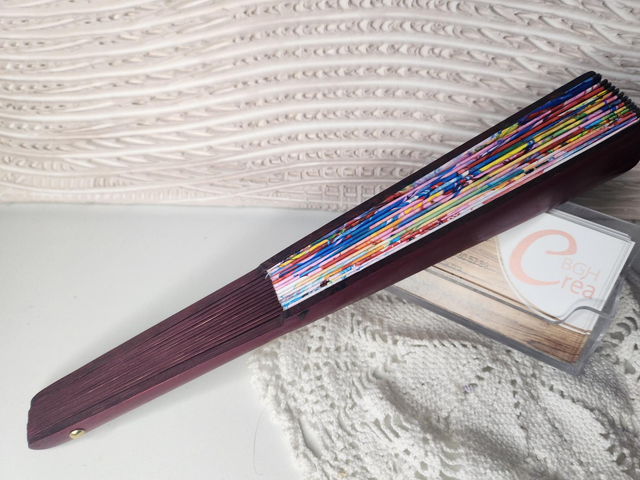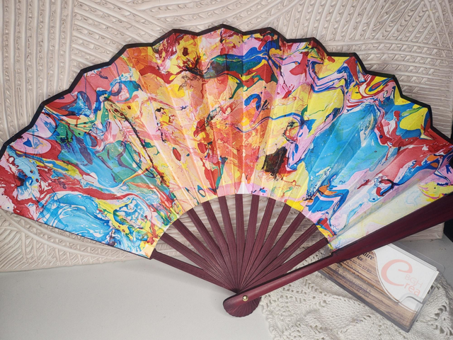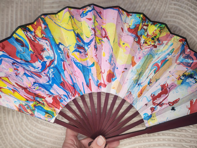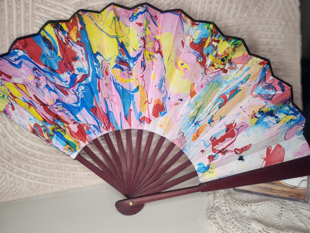 Eventail bois et tissu peint avec la technique de l'hydrographie.
