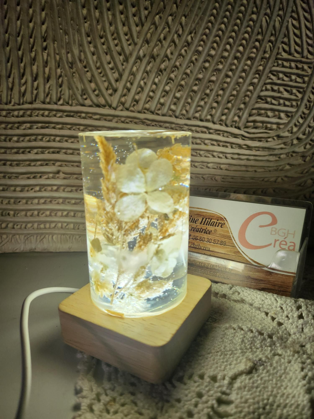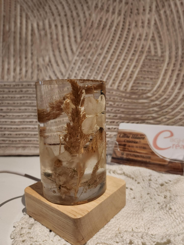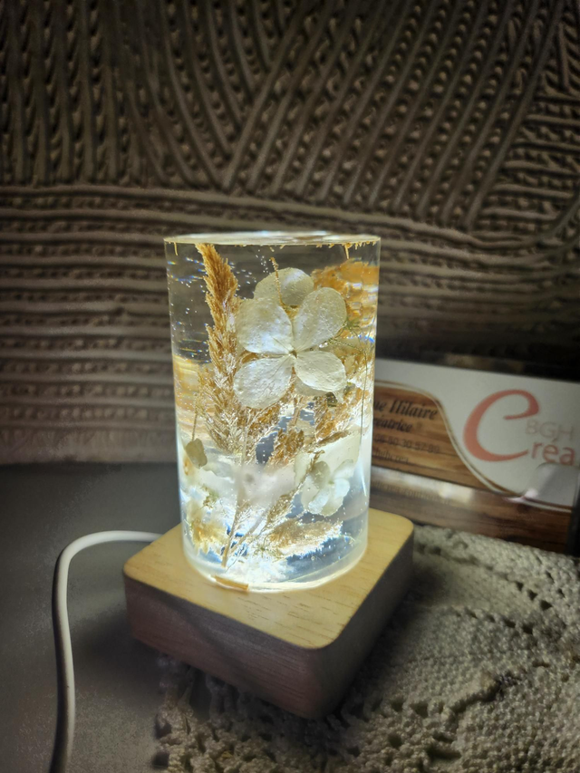Lampe d'ambiance cylindrique résine et fleurs séchées ton blanc. Posé sur un support bois lumineux. LED. A brancher (câble USB)