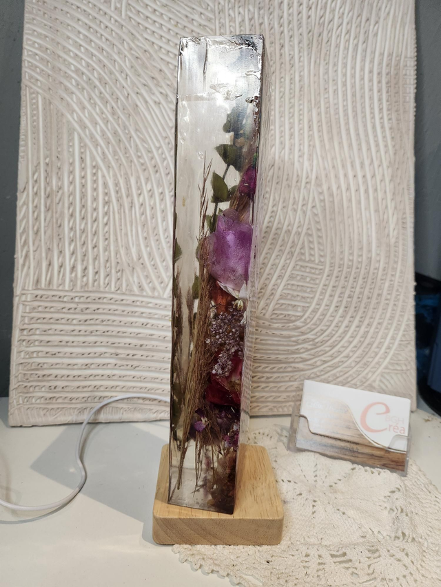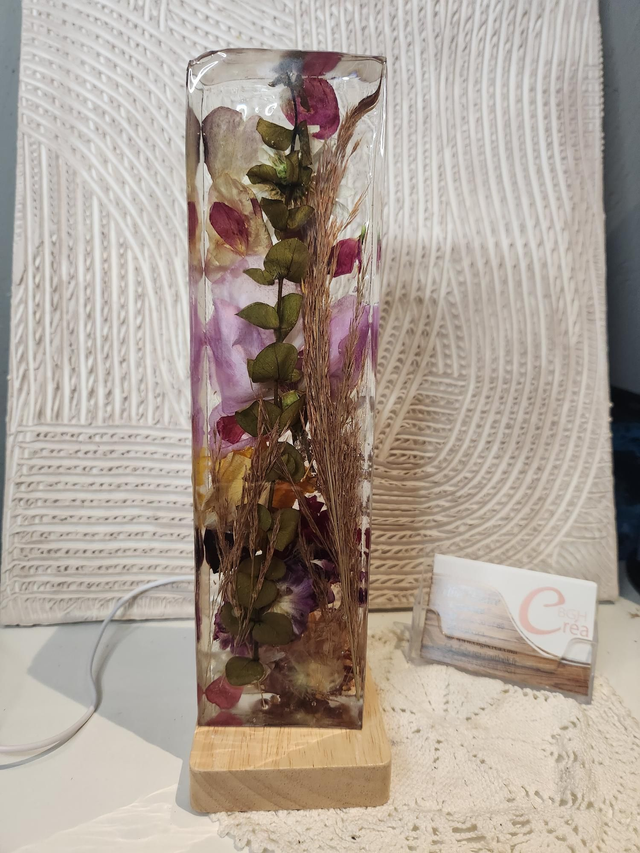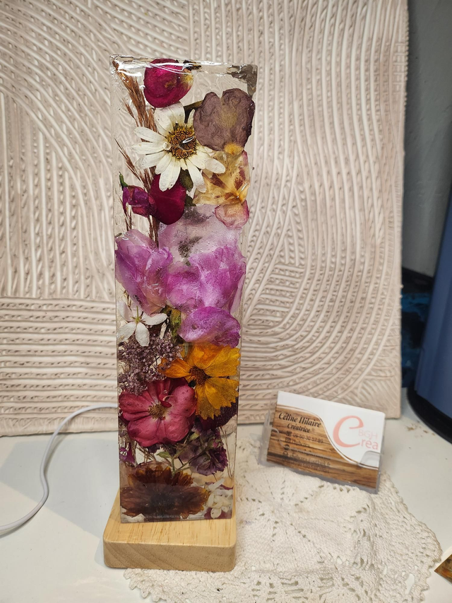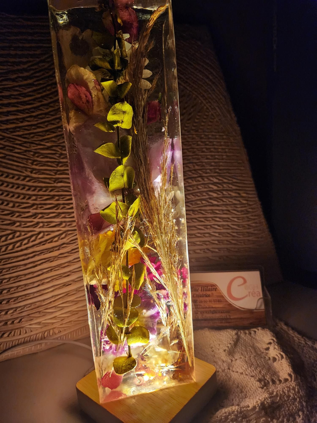 Lampe d'ambiance en résine avec fleurs séchées mélangées.