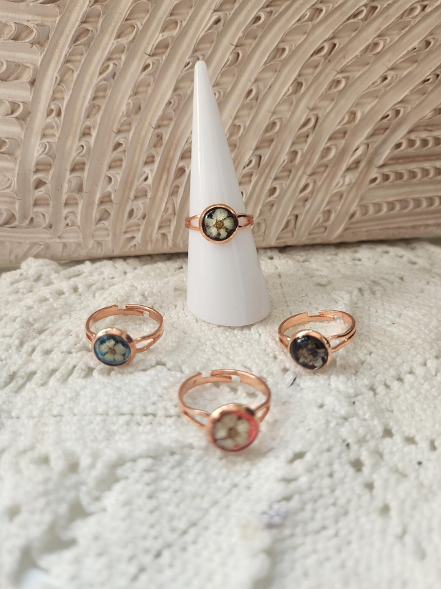 Bague fond rose avec fleur de spiree . Couleur cuivre