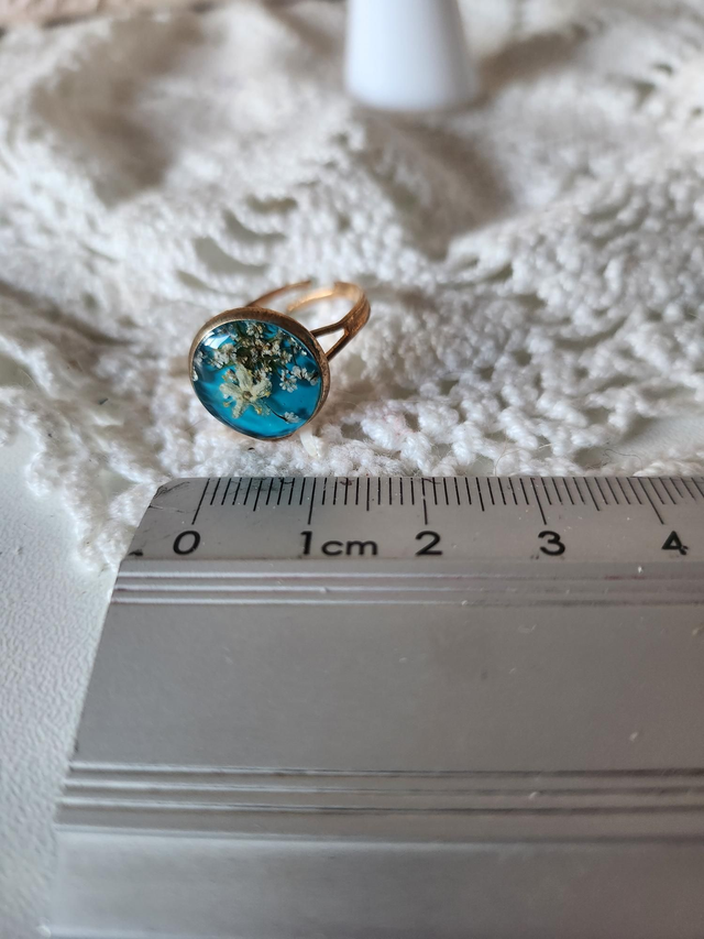 Bague fleurs séchées résine fond bleu.