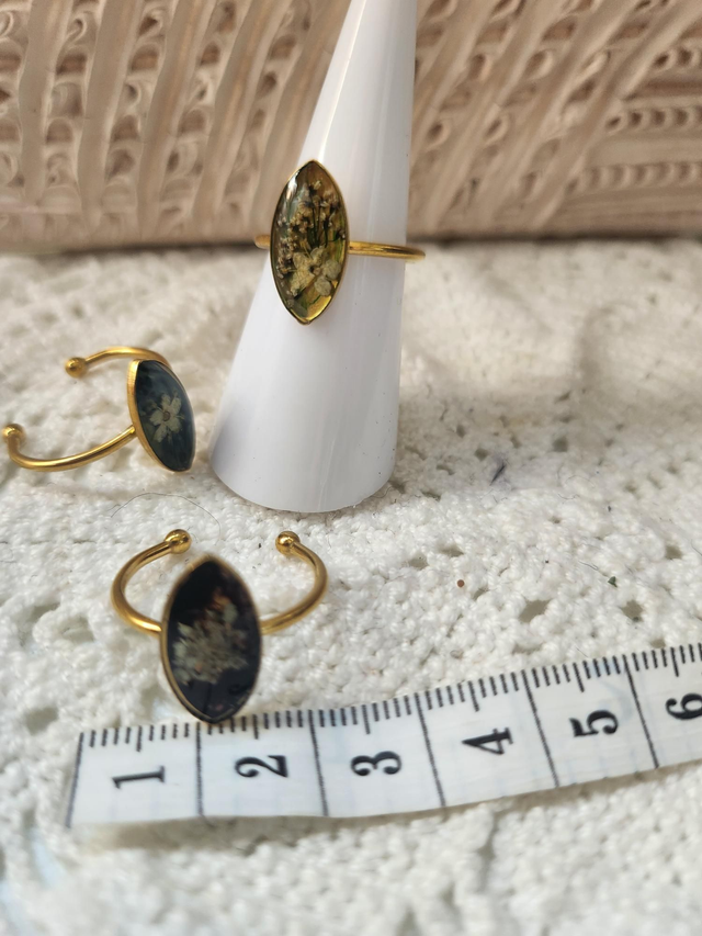 Bague ovale fond noir avec fleurs séchées. Couleur argent