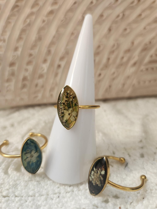 Bague ovale fond noir avec fleurs séchées. Couleur or