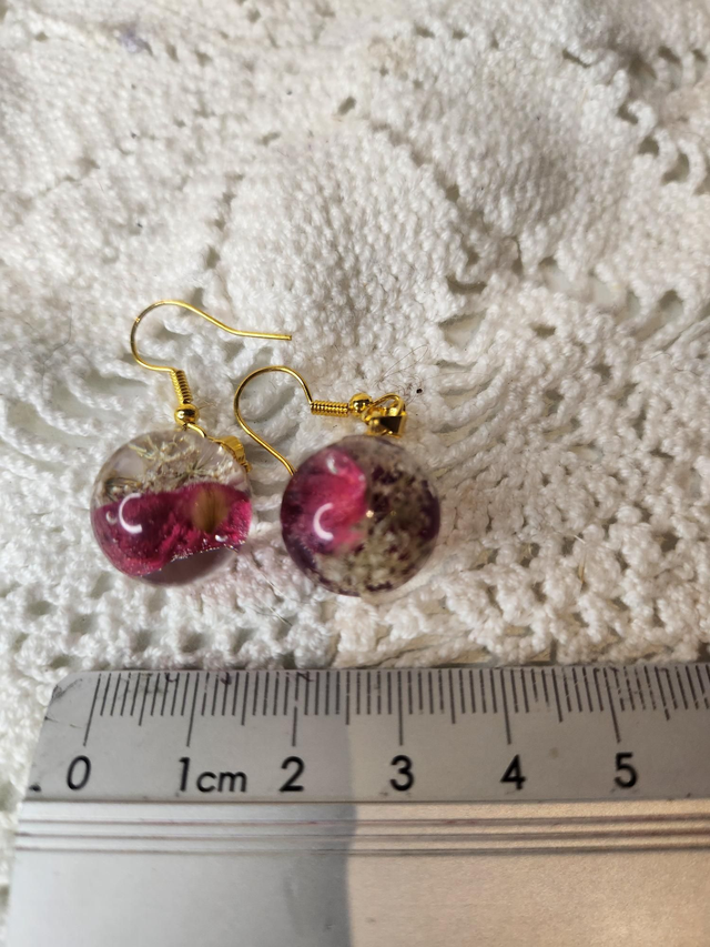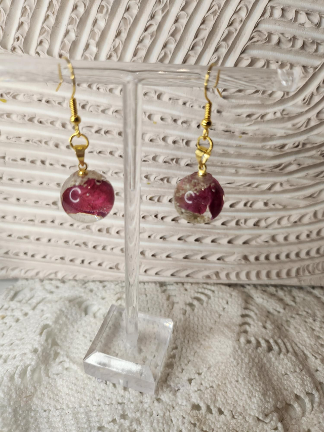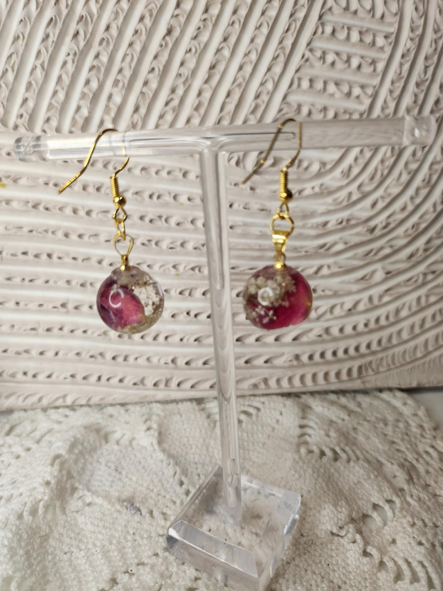Boucles d'oreilles boule en résine et fleurs séchées roses